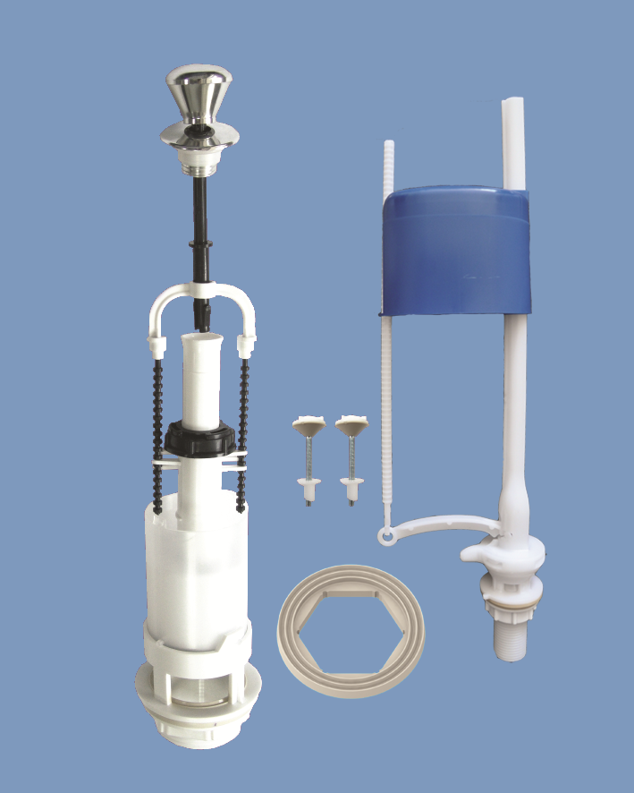 Комплект: Наполнительный клапан с нижней подачей воды, выпускной клапан с металлизированной или пластиковой ручкой, комплект крепежа, прокладка между бачком и унитазом, инструкция по установке.