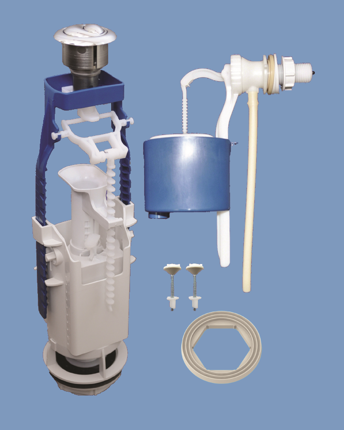 Комплект: наполнительный клапан с пластиковым штуцером, выпускной двухуровневый клапан с металлизированной или пластиковой кнопкой, комплект крепежа, прокладка между бачком и унитазом, паспорт-инструкция по установке.
