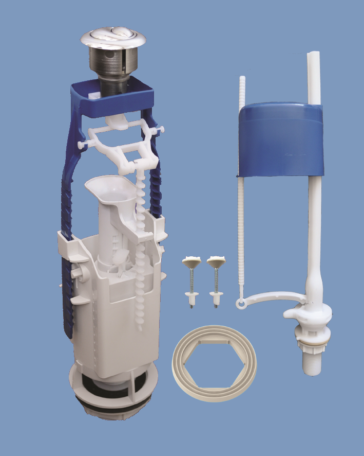 Комплект: Наполнительный клапан с нижней подачей воды, двухуровневый выпускной клапан с металлизированной или пластиковой двойной кнопкой, комплект крепежа, прокладка между бачком и унитазом, инструкция по установке.