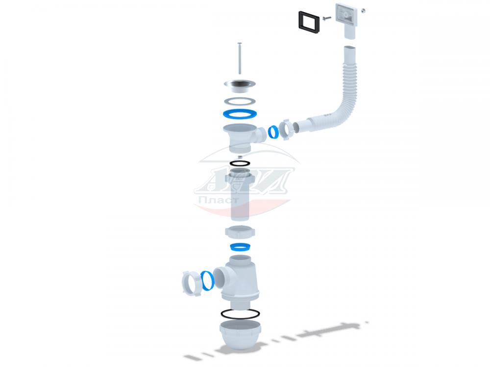 Сифон для кухонных моек с диаметром сливного отверстия 50мм, бутылочного типа с увеличенным корпусом. С разборным выпуском и нержавеющей решеткой, с гибким прямоугольным переливом для моек из нержавеющей стали. Корпус перелива оборудован универсальной прокладкой для круглых и прямоугольных моек, нужная сторона прокладки достигается путем переворота. Выход для подключения к канализации 40мм