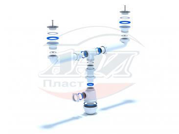 Сифон для кухонной мойки с двумя чашами и сливными отверстиями диаметром 50мм. Выход для подключения к канализации 40мм