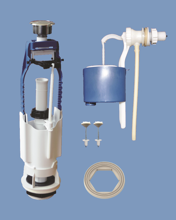Комплект: наполнительный клапан с пластиковым штуцером, выпускной клапан с металлизированной или пластиковой кнопкой, комплект крепежа, прокладка между бачком и унитазом, паспорт-инструкция по установке.