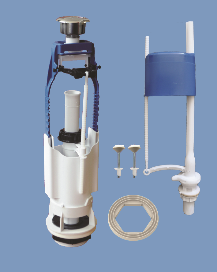 Комплект: Наполнительный клапан нижней подачей воды, выпускной клапан с металлизированной или пластиковой кнопкой, комплект крепежа, прокладка между бачком и унитазом, инструкция по установке.